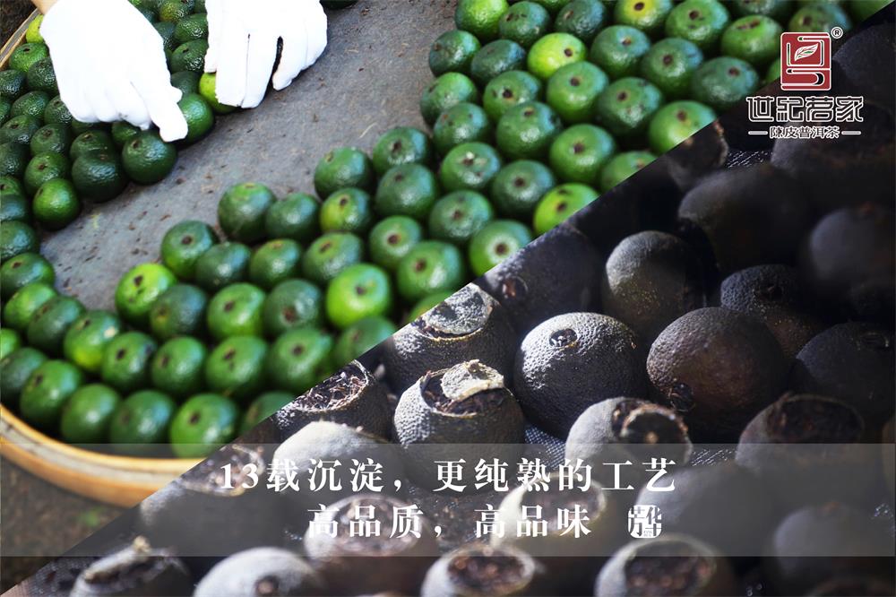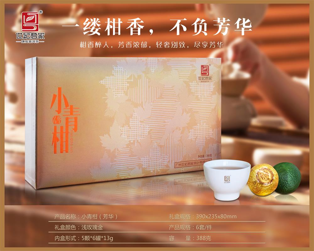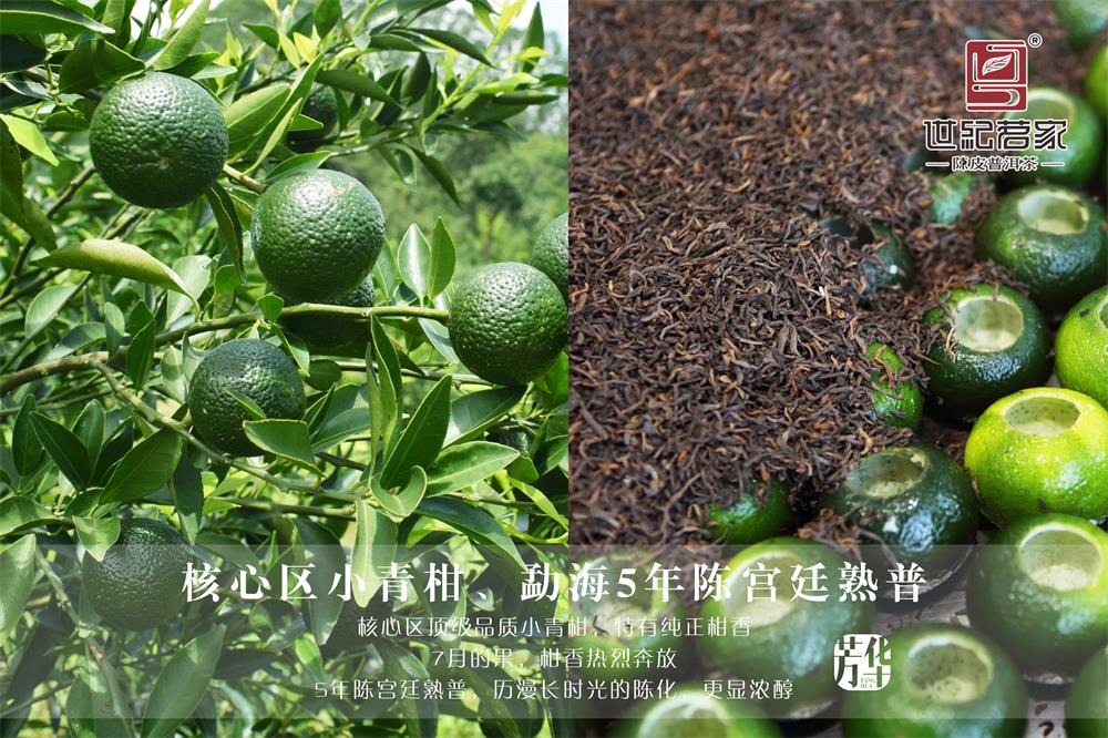 核心区顶级品质小青柑,柑香纯正;7月果芳香性挥发油达到顶峰,柑香尤为浓郁芬芳;5年陈宫廷熟普,历漫长时光的陈化,更显浓醇顺滑、饱满纯正、香气馥郁!顶级配搭,高端品味。