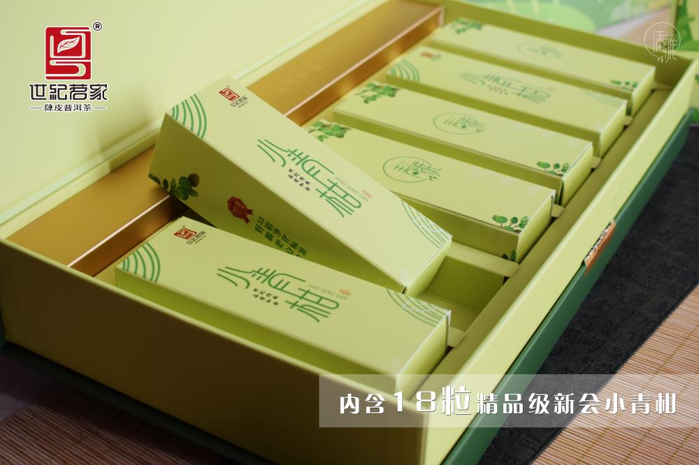 盒中有盒,单粒茶独立入小盒,更显精致、优雅、上档次!居家、接待饮用十分便捷,外出旅行则方便携带!整个礼盒内含:18粒精品级新会小青柑!
