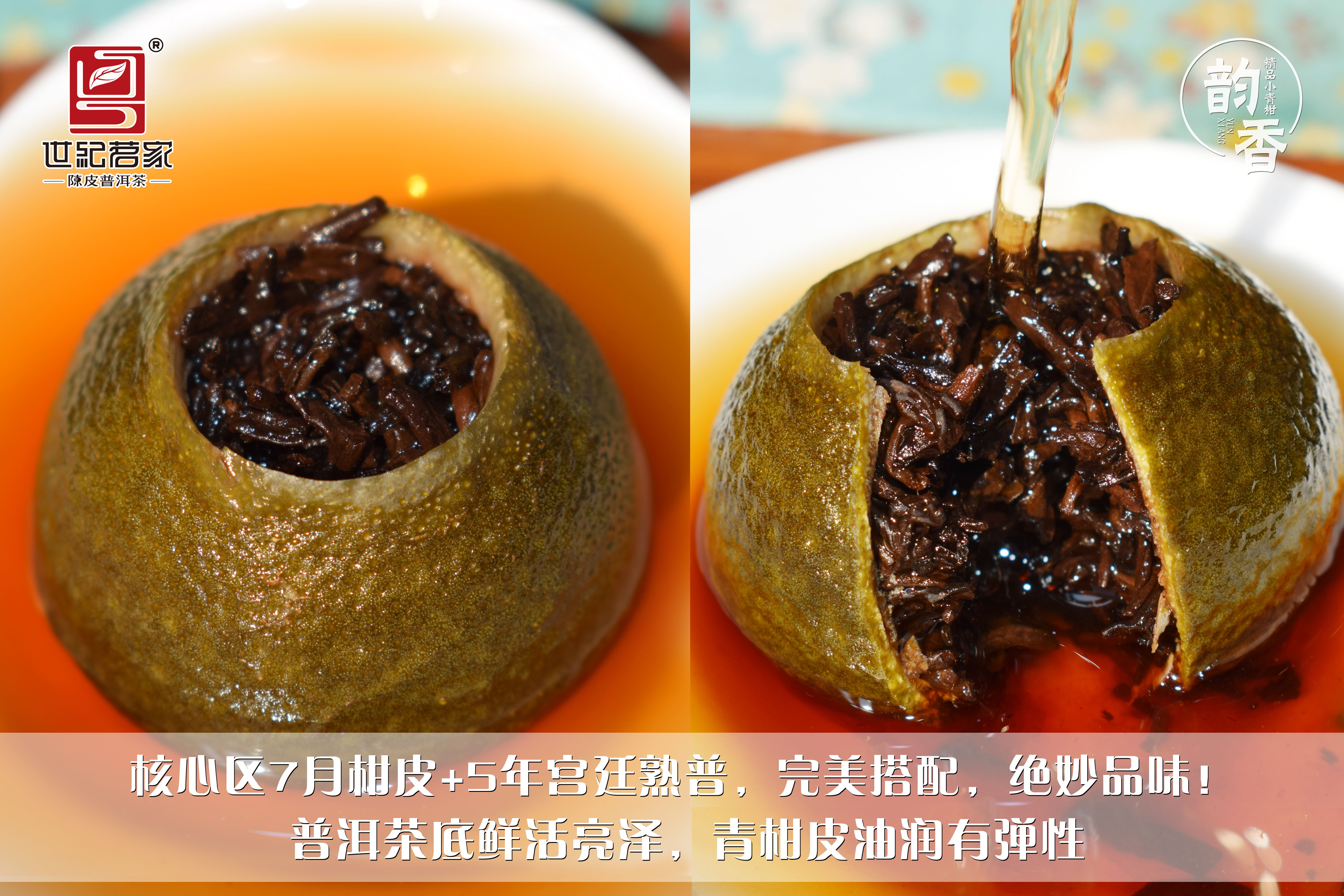 核心区顶级品质小青柑,柑香纯正;7月果芳香性挥发油达到顶峰,柑香尤为浓郁芬芳;5年陈宫廷熟普,历漫长时光的陈化,更显浓醇顺滑、饱满纯正、香气馥郁!两者顶级配搭,经十余年沉淀柑普制造工艺精心打造,成就一款高品味小青柑。品之,柑香纯正,清甜温润,甘醇浓郁,韵味悠长……