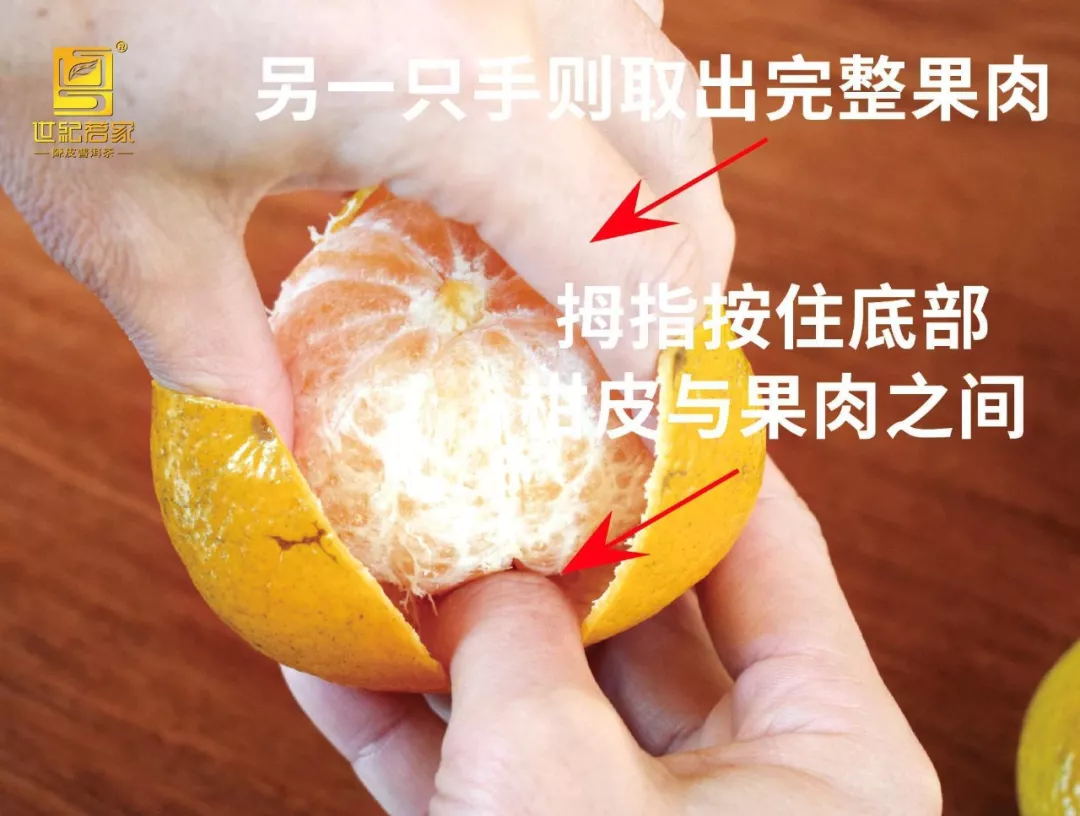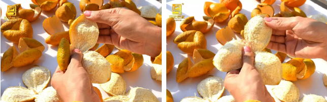 晒皮(软皮) 开好的果皮,阳光下晒约4小时(以柑皮足够软化,柑皮较容易反卷而不破裂为宜,不能过于干硬;期间可试几次),即进行翻皮。