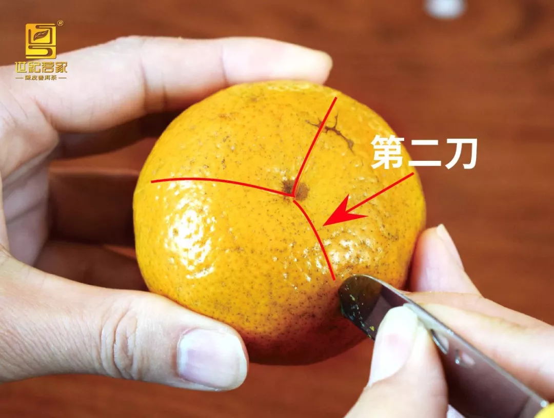 ① 体验二刀法 体验二刀法(以果蒂部相连为例)如下图,果蒂朝上,起刀点距离果蒂位约1.5cm(以形成充分的三瓣相连),力度掌握以不划伤果肉为宜(以避免柑肉汁渗入果皮影响品质)。 说明:工厂工人开皮时会有专业手套以减少对柑皮的品质影响,现在体验只能“徒手”了。 第一刀(如下图) 第二刀(如下图) 从果底部起刀,将另3分之2果皮一分为二(即形成均衡3瓣皮),停刀点相同。 皮肉分离(如下图) 刀尖轻轻撬起柑皮一角,用拇指依次剥离柑皮,剥离第3瓣皮时拇指顺势按住底部柑皮与果肉之间,另一手则取出整个果肉,完成取皮。取皮过程注意防止果皮的破裂。