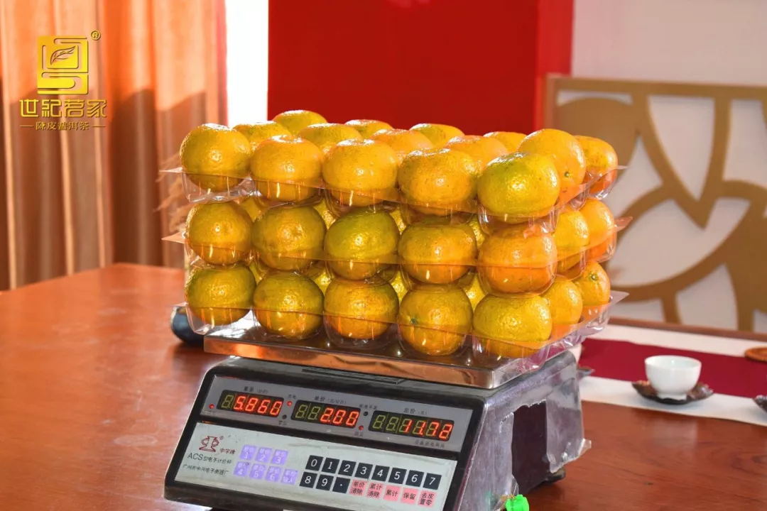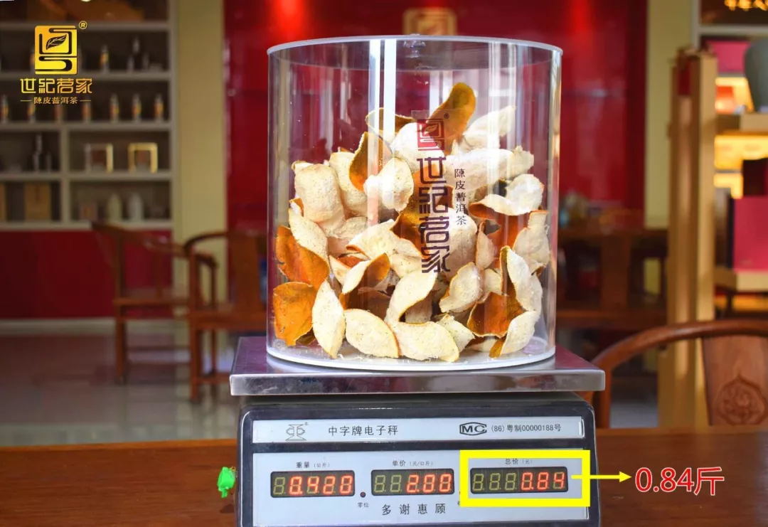 新柑皮称重 结论:11.7斤大红柑鲜柑果(果型中等),得鲜果皮2.8斤,后得干皮0.8斤,随着存放水分继续进一步蒸发,过一段时间预计干皮重量将减至约0.6斤,跟平时所说的大红柑20-22斤鲜果得1斤皮大体相符;(果型大小不同会存在差异;同时,随着持续储存,柑皮中的水分会继续蒸发,皮的重量会有所减轻。直至满5年时,陈皮的性状才趋于稳定)。