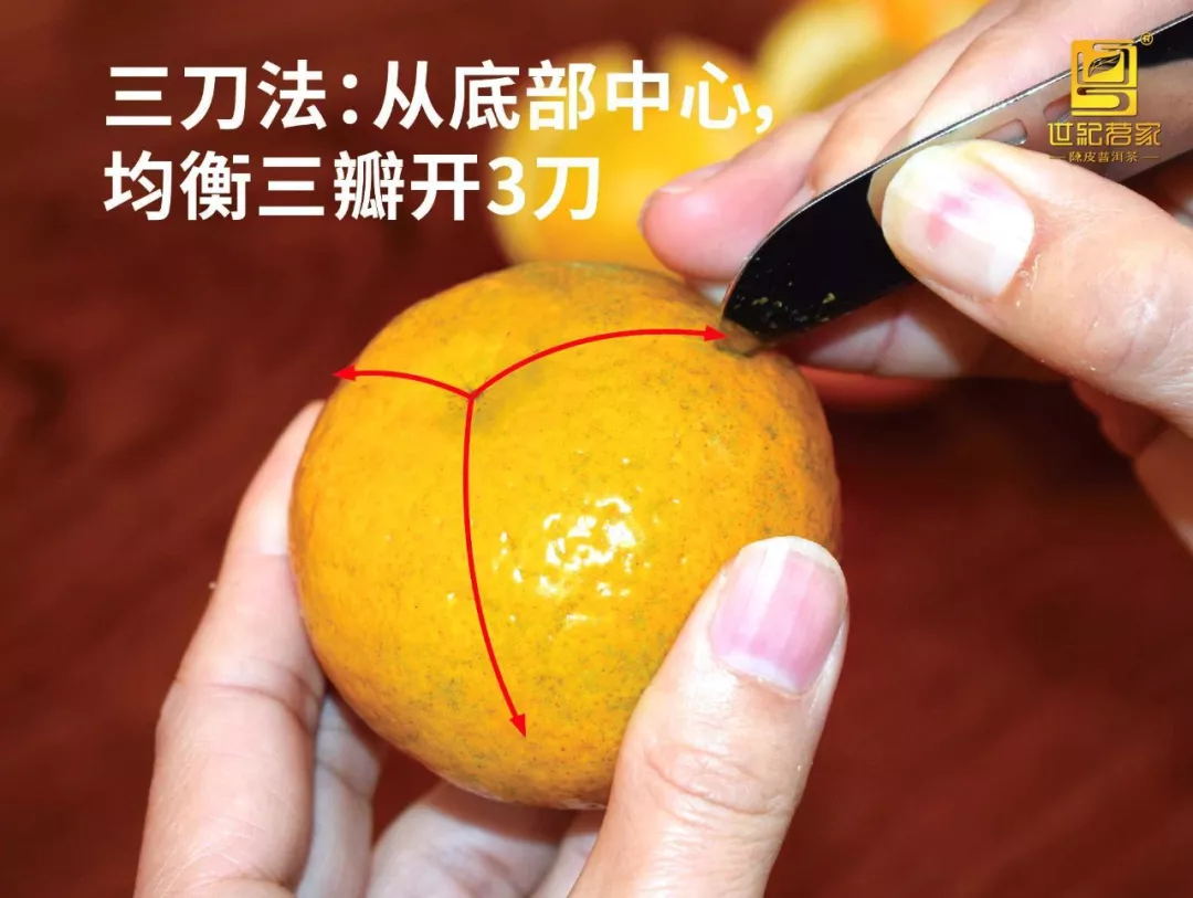 ② 体验三刀法 总体要求与二刀法一致,只是行刀法有些差别;方法:柑果底部朝上,以底部中心为起刀点,按均衡三瓣先后划3刀,以形成3瓣皮(同样果蒂部位形成充分的三瓣相连);皮肉分离方法与上述二刀法一致。