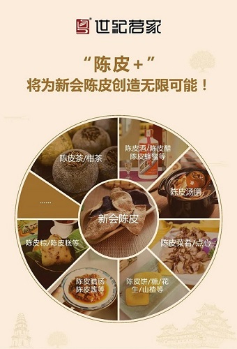 “陈皮+”指:基于新会陈皮“药食同源”的核心价值,充分利用其“和百物、调百味”的特性,充分发挥其“可入茶、入膳、入食”的多用途性,将新会陈皮与其它食材巧妙配搭,制作出的健康养生食品。如陈皮普洱茶,陈皮酒,陈皮饼,陈皮糖,陈皮汤膳,陈皮菜肴等。