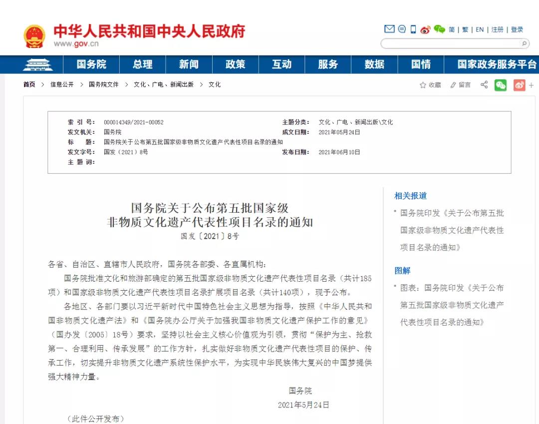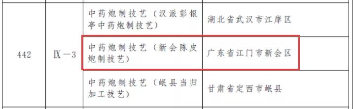 2021年6月10日,国务院发布《关于公布第五批国家级非物质文化遗产代表性项目名录的通知》,其中,新会陈皮炮制技艺(中药炮制技艺)正式入选传统医药国家级非物质文化遗产代表性项目名录。