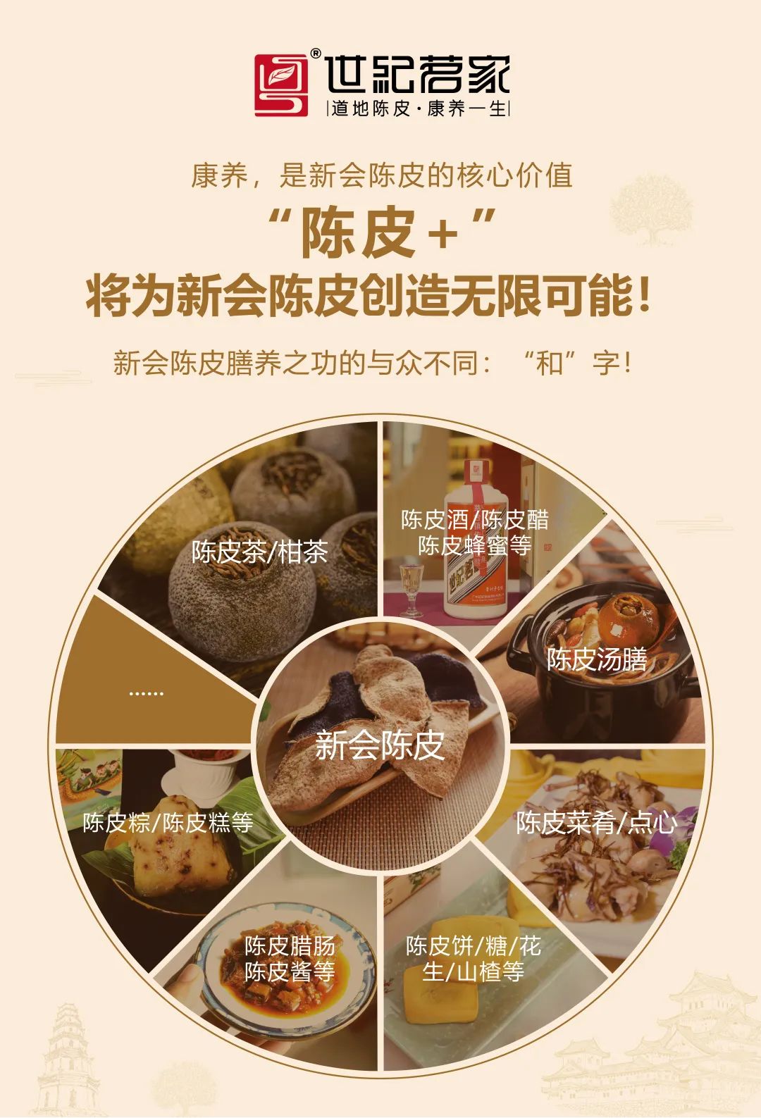 “和百方”,因此可以“入百膳”!养生膳食中,新会陈皮是“百搭”的杰出代表!陈皮作为膳食材料,可单独使用,如陈皮粥等。亦可利用新会陈皮“和百方”的特点,可与其他绝大多数的药材或食物组成功能组合。同时,在调味、增味或形成独特风味方面,新会陈皮同样是“百搭”,与大多数的食材都能进行搭配,并能碰撞出独具特色的美味;新会陈皮绝对是不可多得的特色食材。百搭,香气独特,鲜美可口,开胃,刺激食欲,多吃而不腻,老少皆爱,美不胜言!烹制牛、羊、猪、鸡、鸭、鹅、海河鲜、鸽等美食,加入新会陈皮皆可成为上品;添加制作绿豆沙、红豆沙等甜品,立马成为神来之笔……